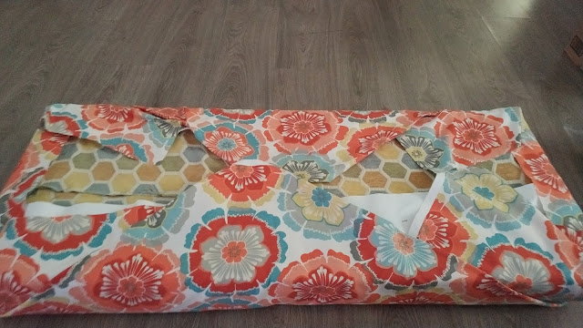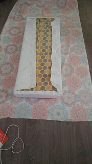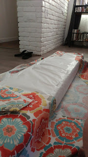 Basically I wrapped the benches like a present (which I am not so good at, but this is a forgiving pattern - stripes would have sucked) and started gluing.