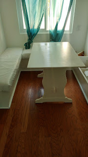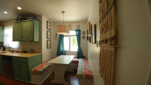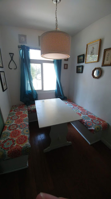 Our adorable galley kitchen has the cutest breakfast nook and when we looked at the house originally the benches were covered with cute retro fabric. The fabric was worn and dirty, but it was cute. When we moved in they had recovered the benches with white vinyl nastiness. Practical yes, fun - not in the least.