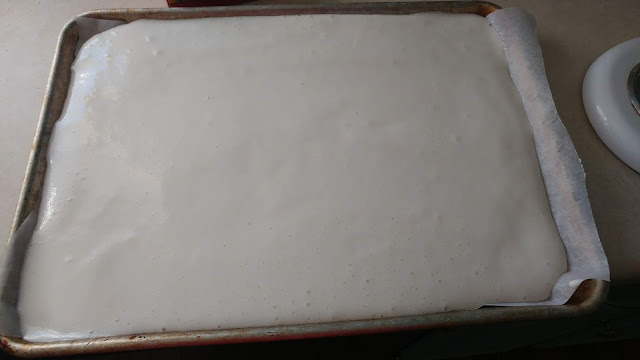 | Pour prepped cake mix into the lined cookie sheet. |