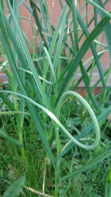 Just in case you forgot what a scape look like still attached to the garlic plant.