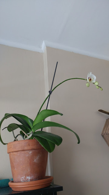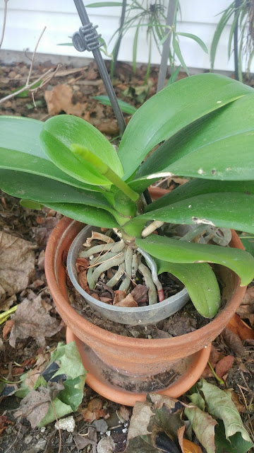 In the summer I take most of the houseplants outside to be happy and provide a place for the squirrels to hide nuts never to be found again. This summer about halfway through I decided to take the orchid out - I don't think I have ever put an orchid out in the summer, but why not. The orchid made its outside debut later than the others, and lived in a semi shady part partially under a bush. I would water and check on the plants every so often and to my surprise the orchid started shooting out new roots and what I thought might be an attempt at the beginnings of what might be a blossom stem.